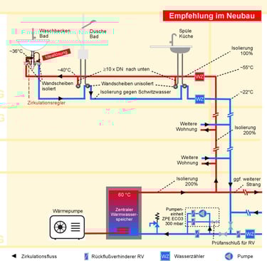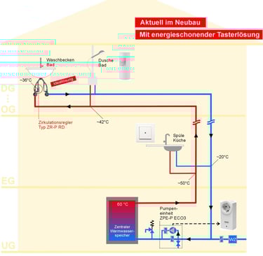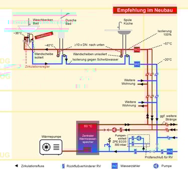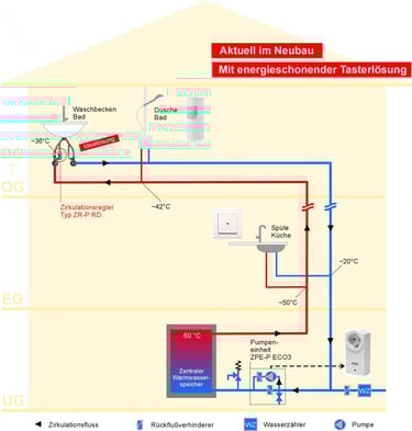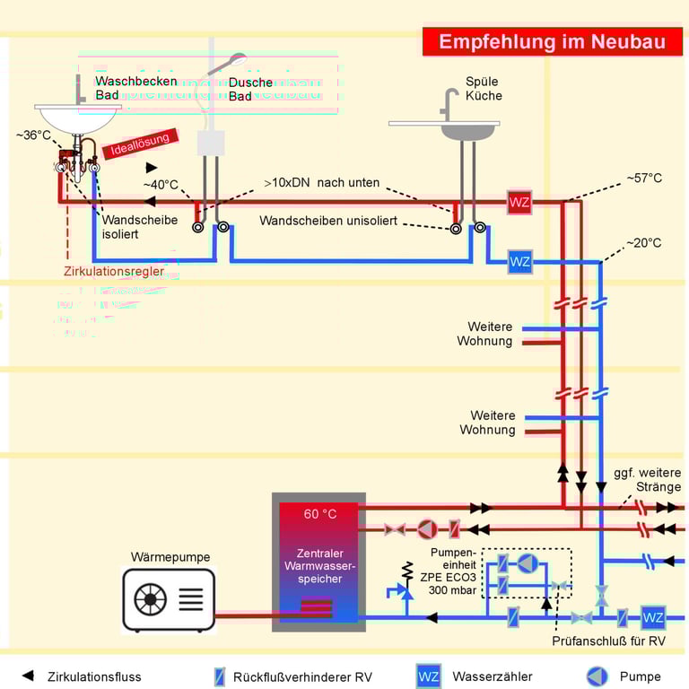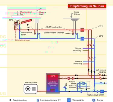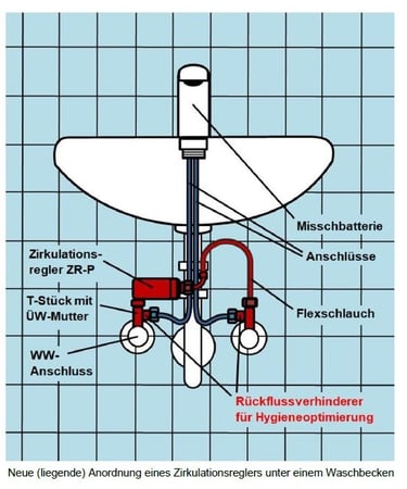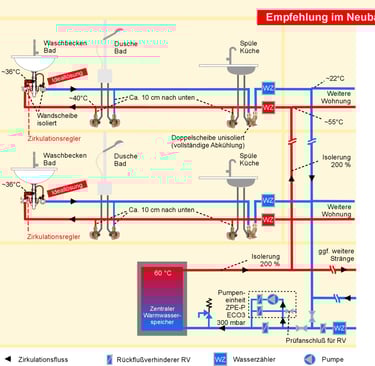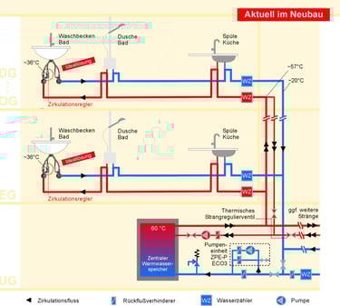 Funktionsweise: Heißes Wasser (z. B. 60 °C) kühlt in der WW-Leitung auf dem Weg zur letzten Zapfstelle am Strangende auf ca. 36 °C ab. Dieses Wasser wird dann über einen Zirkulationsregler in die Kaltwasserleitung zurückgeführt, wo die Temperatur weiter Richtung Wandtemperatur sinkt. Diese permanente, langsame Zirkulation verhindert zuverlässig Stagnation in Warm- und Kaltwasserleitungen und sorgt überall sofort für warmes Wasser, ganz ohne separate Zirkulationsleitung.