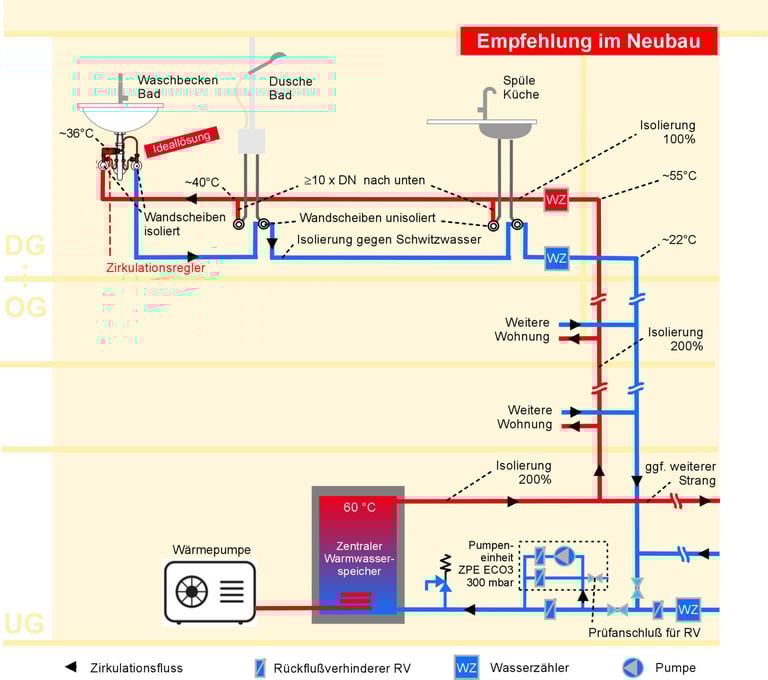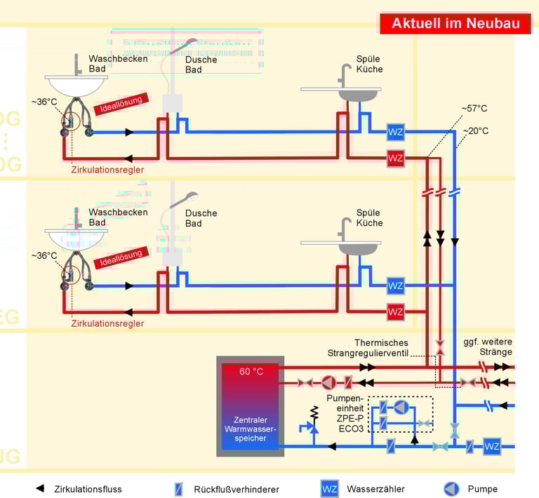 Für Steigstrang und Keller bleibt die klassische Zirkulation dort, wo lange Leitungswege bestehen. In den Wohnungen übernimmt die Neue Zirkulation ab Wohnungszähler: Warm- und Kaltwasser werden bis zu den Wandscheiben durchgeschleift und damit alle Leitungsbereiche aktiv durchströmt.