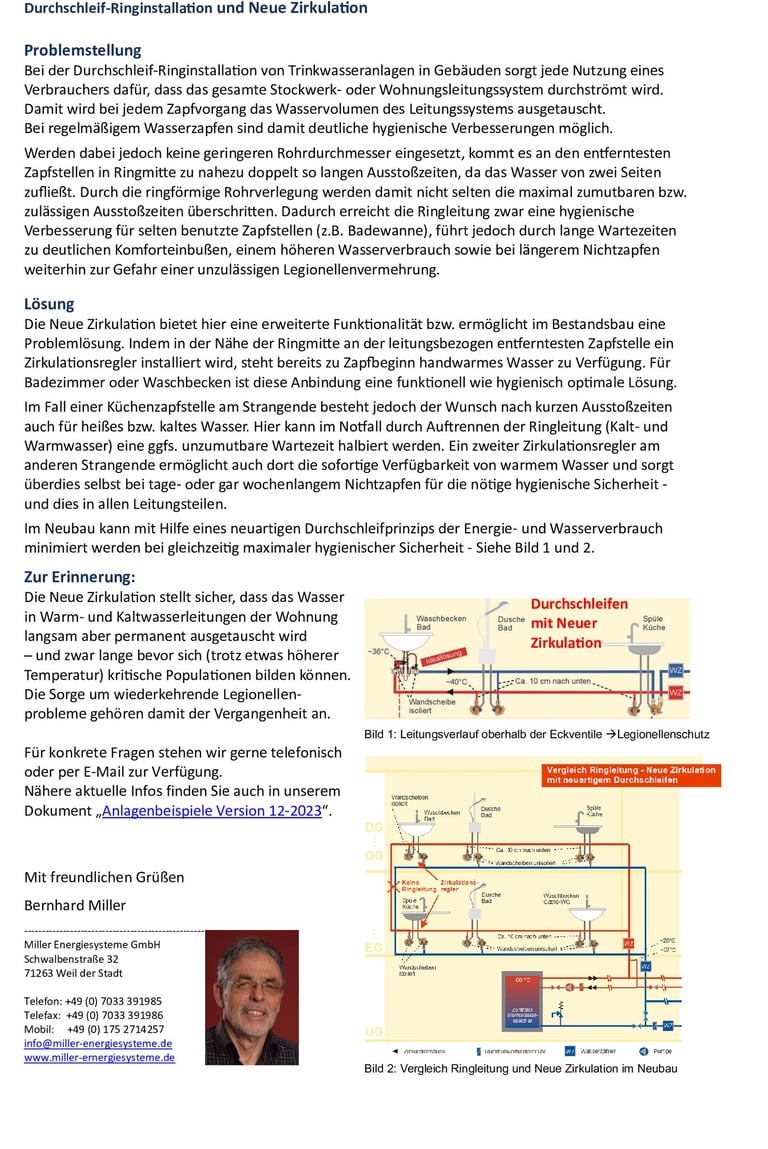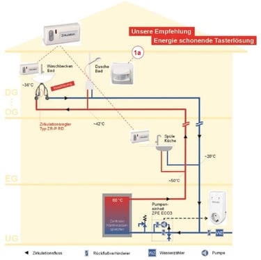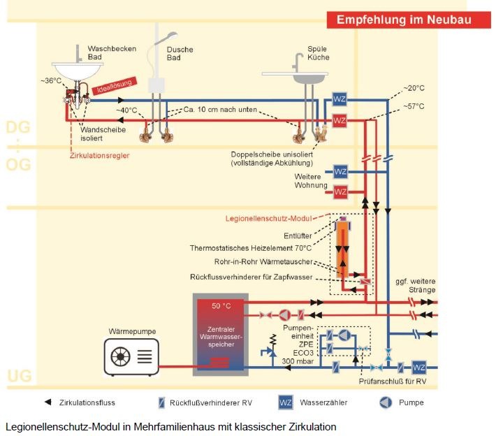 • Erstmalig sicherer Legionellenschutz in Gebäuden trotz geringer Speichertemperaturen. Die Beseitigung des stagnierenden Wassers durch die Neue Zirkulation wird ergänzt um ein Legionellenschutz-Modul, um ins Gebäude nachströmendes Wasser zu desinfizieren.